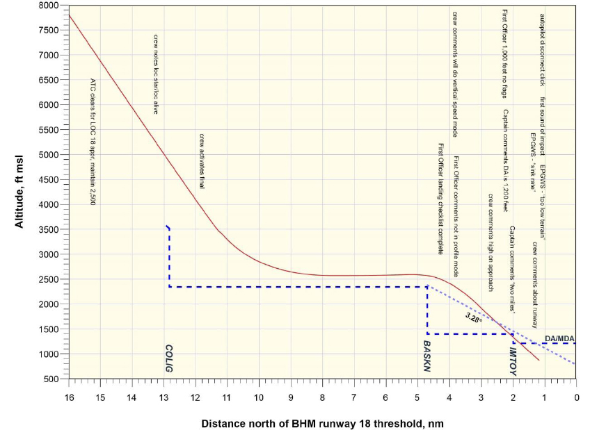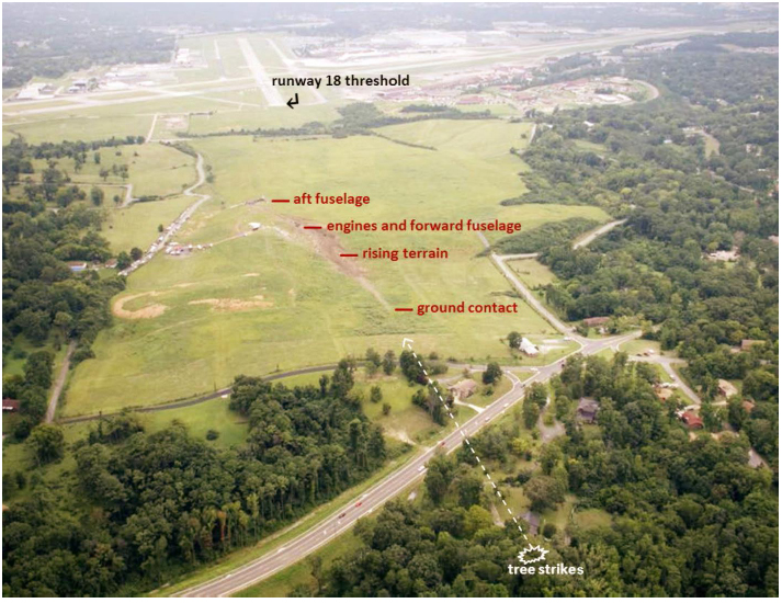 The site of the crash in relation to the intended landing runway can be seen in the annotated picture below. It was noted that the crew had expected to become visual at about 1000 feet agl based on the weather reports they had received but in fact had only seen the runway about 5 seconds before contact with the trees began. The vertical profile flown compared to the charted step-down and CDFA procedures is shown on the diagram below the picture.