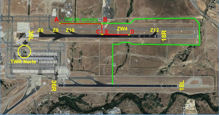 It was found that the vehicle had initially been driven north on the service road which is to the west of runway 36L/18R proceeding from Point A to Point B marked on the diagram below before turning right on taxiway ZW4 and continuing across the parallel taxiway. On reaching the active runway, the vehicle initially turned right at Point C before reversing direction and driving north to Point D, approximately 2,700 metres from the start of the 4,179 metre-long runway at which point the direction of travel was reversed and the vehicle was again driven south before it pulled to the side and off the runway at Point E where it was when the aircraft passed.