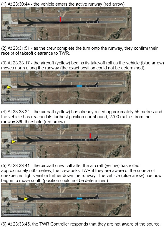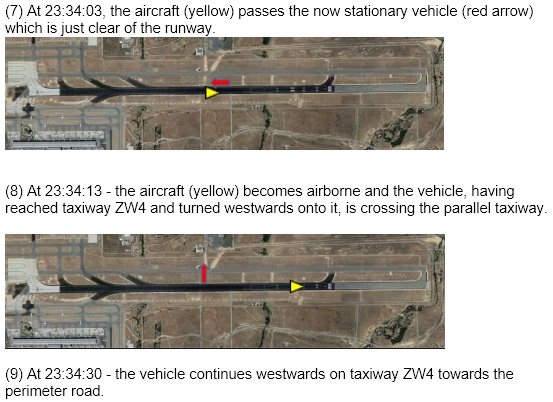 The vehicle driver subsequently stated that he had not been supposed to be working on the night in question and was only doing so to replace a colleague. He said that "he usually called his manager to check the exact location he should go to but that night did not do this". The driver had not selected the vehicle's anti-collision light on and it was not equipped with a radio or a transponder. He reported that he had entered the active runway believing that it was the closed one to which he had been tasked to deliver supplies. On entering the runway, he had been searching for the workers he had expected to find using the vehicle headlights whilst driving between the runway western edge and its centreline and after travelling north had reversed direction when he did not find them. Only then had he seen bright lights in the distance. He had initially thought that these may be lighting at the work sites but "soon he noticed that the lights were approaching with great speed and realised that they were from an aircraft". He stated that having cleared to the side of the runway, "he observed the light on the tip of the wing passing close but not above the vehicle" and claimed that "at no point had he turned off the vehicle headlights".