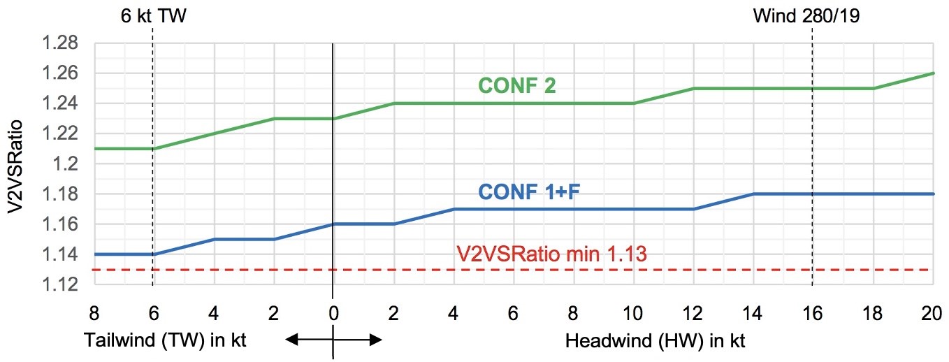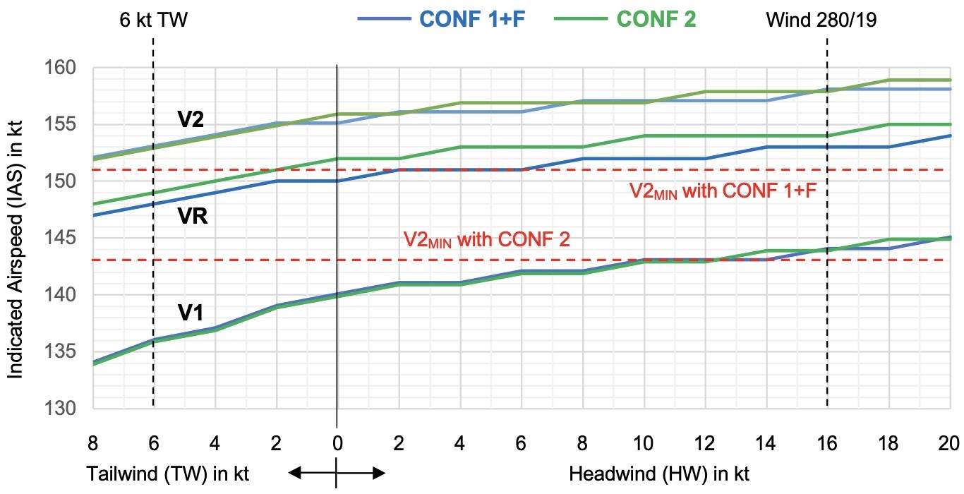 However, although the V speeds themselves are not much affected by the chosen flap/slat configuration (CONF), since the VS increases with a lower flap setting, a significantly lower V2/VS ratio applied and this means a lower safety margin in relation to a stall (see the illustration below) as well as, importantly, rotation at a speed much closer to VS.