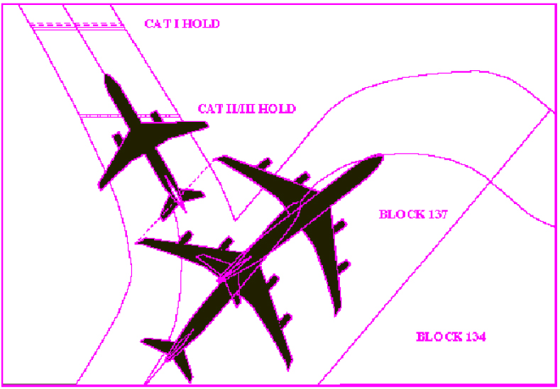 - Issue of a Class II NOTAM showing the four departure hold areas and explaining their significance in terms of the permanently illuminated (in normal daylight visibility) green centerline lighting and reminding pilots that separation from other aircraft is their responsibility in these areas.