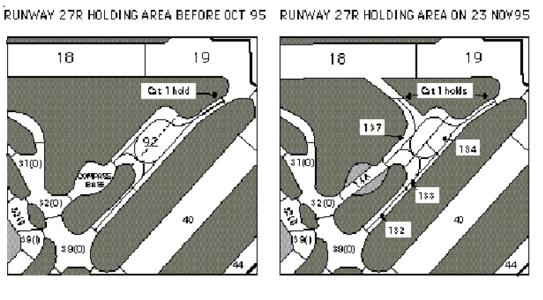 An Investigation was carried out by the UK AAIB. It was noted that both aircraft were being operated in accordance with their respective ATC clearances. It was established that the prior to the accident during the autumn of 1995, a new access to Block 18 of Runway 27R had been constructed which involved subdividing the previous holding area (Block 92) into three new blocks and the relocation of the compass base formerly in Block 92 to another part of the airport. At the time of the accident, each block of the new layout was found to have had a yellow painted taxiway centreline with green centerline lights at regular intervals. At the end of each block there were stop lines with red lights across the centerlines to mark the extremity of the block. The situation before and after the change is shown below in the diagrams taken from the Official Report: