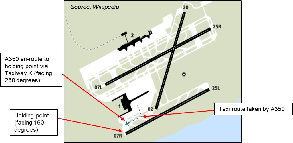 The runway layout at Barcelona with the A350 taxi route to runway 07R shown. [Reproduced from the Official Report]