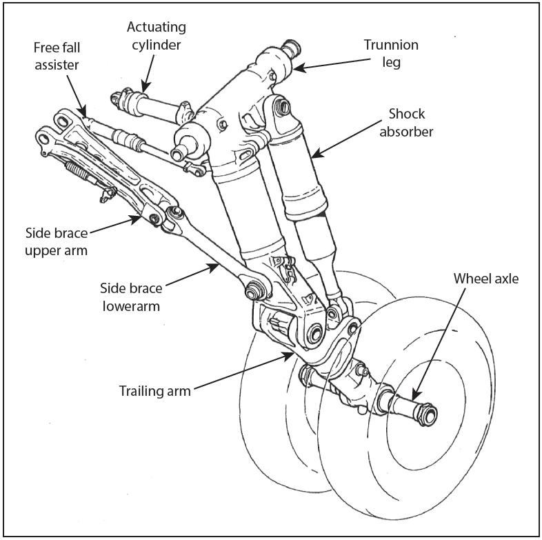 The Investigation found that the cause of the landing gear collapse was a consequence of structural failure in the side brace upper arm of the left main landing gear - see an illustration of the assembly below. This had allowed the main gear leg to continue to pivot outboard beyond its normal fully-deployed position. This had resulted in an excessive load being transmitted to the actuating cylinder attachment to the fuselage structure which had then also failed, allowing the now-unrestrained main trunnion to continue to extend outwards.