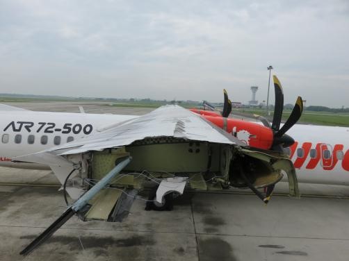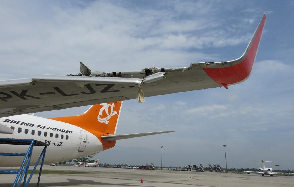 On 3 August 2017, a Boeing 737-900ER (PK-LJZ) being operated by Lion Air on a scheduled domestic passenger flight from Banda Aceh to Medan as JT197 touched down on runway 23 at destination in normal day visibility, and shortly after, collided with an ATR 72-500 being operated by Wings Airlines on a scheduled domestic passenger flight from Medan to Meulaboh as IW1252. Both aircraft sustained substantial damage but none of the 223 occupants were injured and both aircraft were taxied clear of the runway. ATC were advised of resultant debris on the runway but allowed the runway to remain in use until other aircraft subsequently using it had also reported the presence of debris after which it was closed.