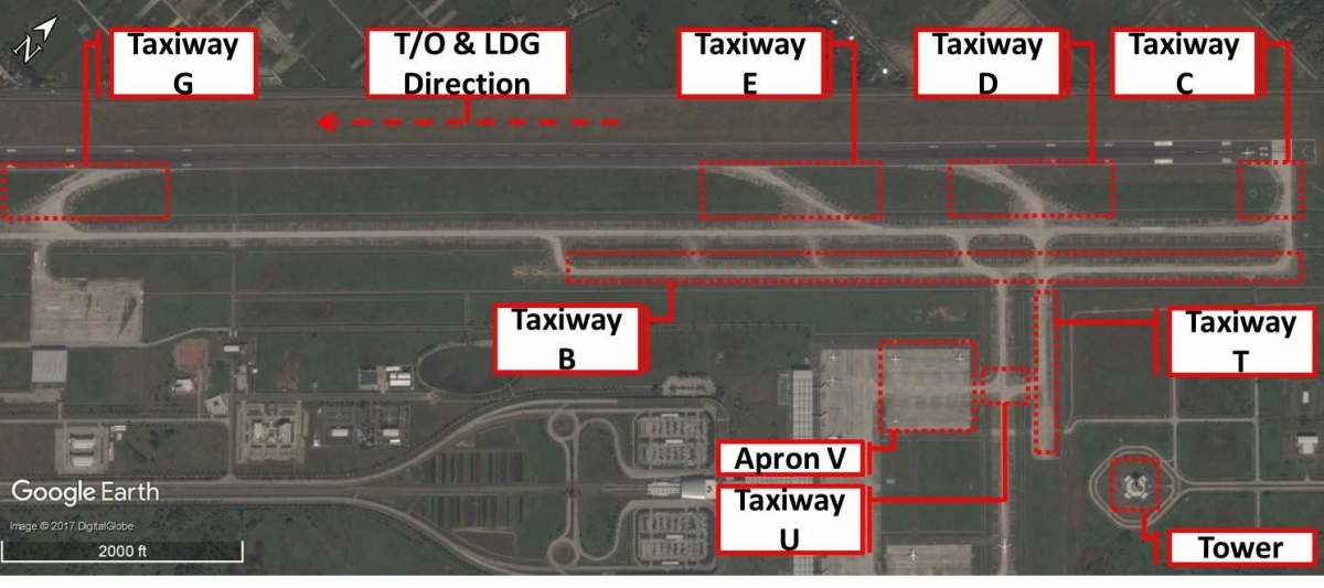 The runway with taxiways identified and the position of the TWR shown. [Reproduced from the Official Report]