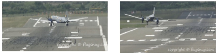 The illustration above showing the aircraft leaving the runway during the second landing also shows a taxiway sign for taxiway ‘L’ just ahead of that taxiway. The aerial survey showed that the left wing passed over this with clearance calculated as just over 1 metre. Whist this sign was outside the 4.2 metre diameter of the six bladed propeller, it was higher than the lowest point of the rotational arc and whilst all airside signage is designed to be frangible, it was considered that had the propeller hit the sign, some damage to the aircraft would have been inevitable.