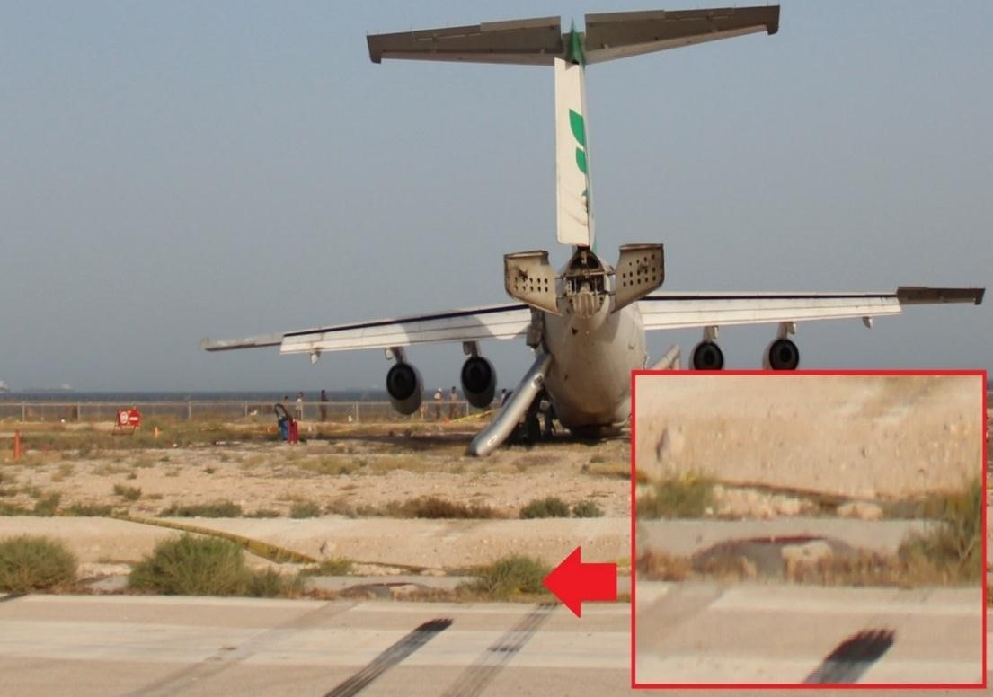 Touchdown on the 2,334 metre long runway did not occur until approximately 685 metres past the threshold at a recorded speed of 121 knots and there was then a significant (7 second) delay in the deployment of the lift spoilers. Although control column position was not recorded on the FDR, it was considered that the fact that pitch attitude during the landing roll had remained negative throughout was likely to have been a result of excessive forward pressure on the column which, crucially, would have reduced the downward pressure on the main landing gear both prior to and after lift spoiler deployment. Both factors would have reduced braking effectiveness. The overrun then occurred with the aircraft speed recorded as 51 knots. It was found that there was no designated Clearway beyond the end of the runway so that there was a greater risk of gear collapse on the uneven surface - note the gulley immediately after the end of the runway in the illustration above.