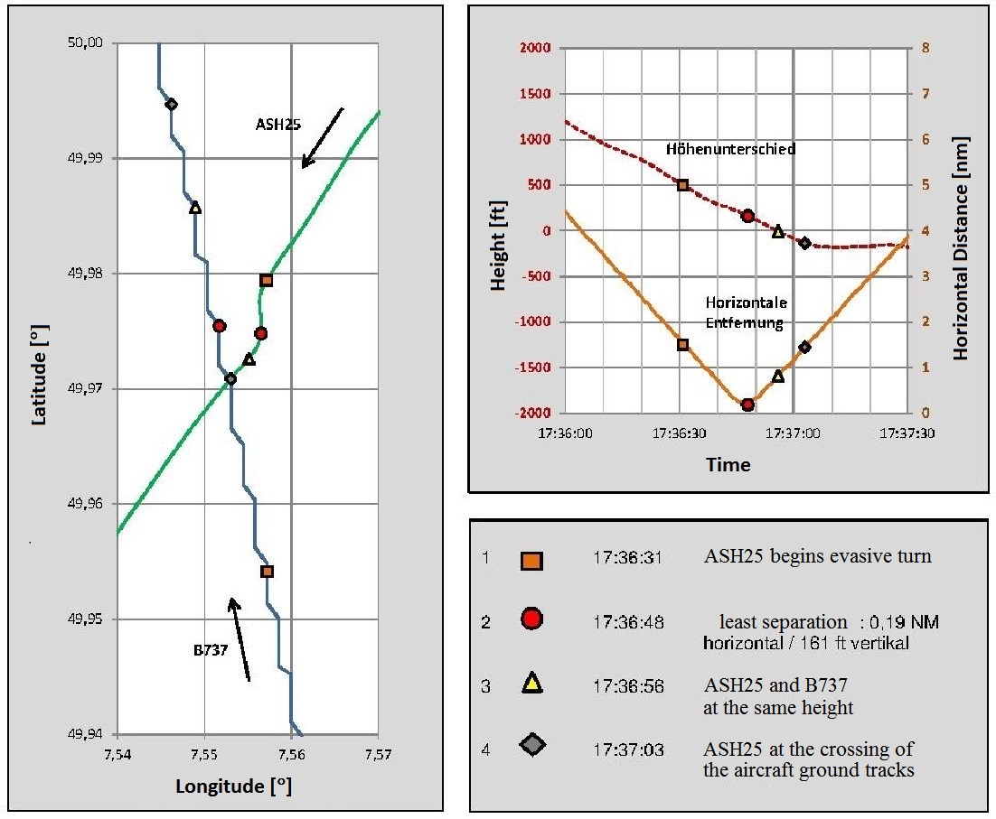 The motor glider, which had the pilot's wife on board, was found to be on a triangular flight with Marpingen being the aerodrome of departure and arrival. Its pilot stated that the glider had been tracking south southwest in an almost cloudless sky with only slight haze domes at 7,000 feet QNH. In-flight visibility had been about 30 km and without the engine running, airspeed had been around 60 knots. At about 6,500 feet QNH, the glider's TRX 1090 ADS-B Traffic Receiver had generated a collision warning for traffic at the same altitude. A transport aircraft with its landing lights on was visually acquired ahead and to the left a range of about 10 km away and at the same altitude. As avoidance action, he had made a left turn with a bank angle of about 45° so as to fly approximately south in the opposite direction to and to the left of the transport aircraft - see the illustration below. His aircraft had been in gliding flight with a sink rate of about 160 fpm. He stated that he had "decided to fly a parallel opposite course to the other aircraft so that he could continuously observe it and react to possible heading or altitude changes if need be". He saw that the other aircraft was a 737 and that it appeared to be maintaining heading and altitude with no avoidance manoeuvre seen. After about a minute, he estimated that the 737 had passed about 165 feet above his aircraft when approximately 150 metres apart laterally. He had noticed that "only at the last moment, while the two aircraft were passing each other, had the 737 Co-pilot turned his head to the right". He had then resumed his original track.