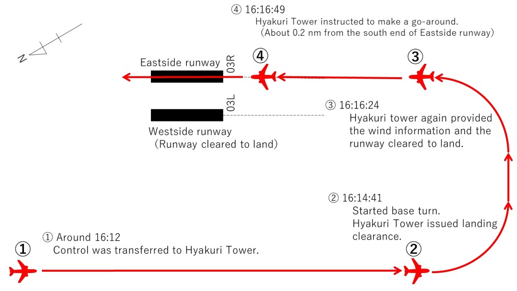 On contacting Hyakuri APP, the flight was initially provided with radar vectors and advised that the anticipated visual approach to 03L, the runway used by civil aircraft, could be expected. When about 5nm north-northwest of the airport, both pilots visually confirmed sighting of the airport and its two runways and advised ATC accordingly. The APP controller responded by issuing clearance for a visual approach to the “westside runway” as 03L was commonly called.