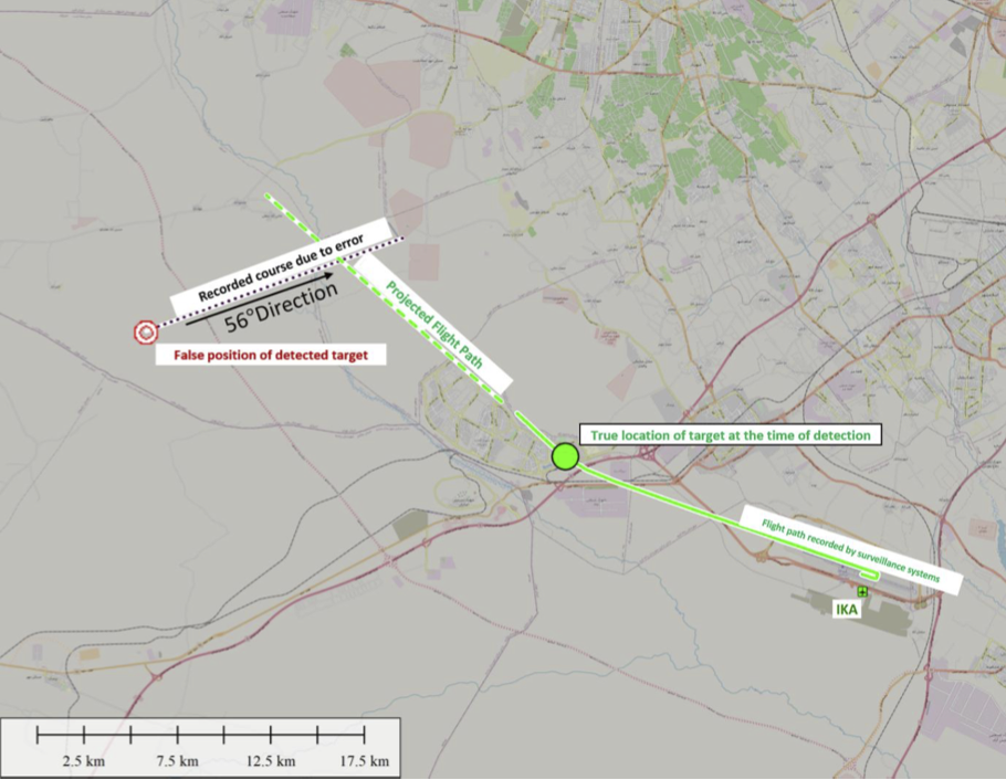 Two minutes after the takeoff of the accident flight, the missile system operator detected a target at a bearing of 250° flying on a 056° track, which put it on track towards Teheran. However, this target was actually the approaching 737 flying a 309° track. The system operator “notified the specifications of the detected target to the Coordination Centre over the communication network” but the message “was not communicated successfully”. The illustration below shows this.