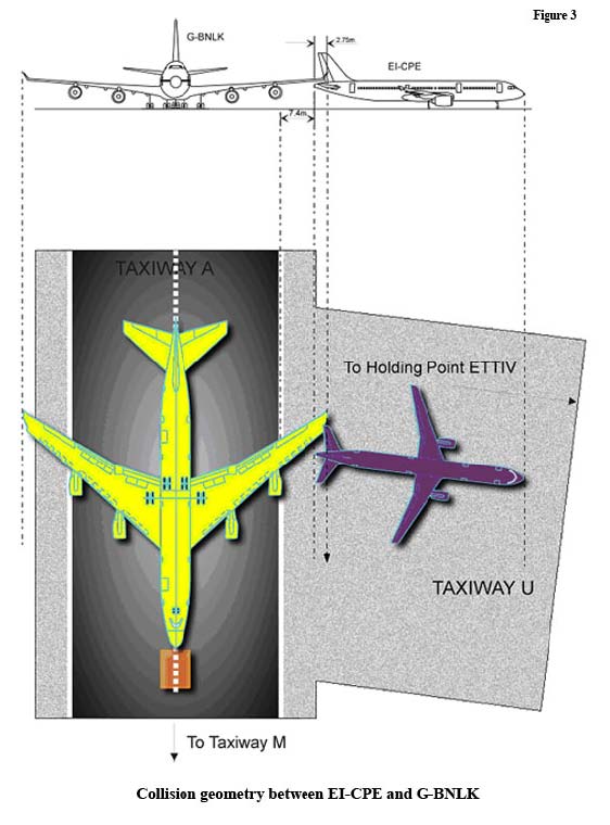 On 23 March 2004, an out of service British Airways Boeing 747-400, under tow passed behind a stationary Airbus A321-200 being operated by Irish Airline Aer Lingus on a departing scheduled passenger service in good daylight visibility and the wing tip of the 747 impacted and seriously damaged the rudder of the A321. The aircraft under tow was cleared for the towing movement and the A321 was holding position in accordance with clearance. The towing team were not aware of the collision and initially, there was some doubt in the A321 flight deck about the cause of a  shudder felt when the impact occurred but the cabin crew of the A321 had felt the impact shudder and upon noticing the nose of the 747 appearing concluded that it had struck their aircraft. Then the First Officer saw the damaged wing tip of the 747 and informed ATC about the possible impact. Later another aircraft, positioned behind the A321, confirmed the rudder damage. At the time of the collision, the two aircraft involved were on different ATC frequencies.