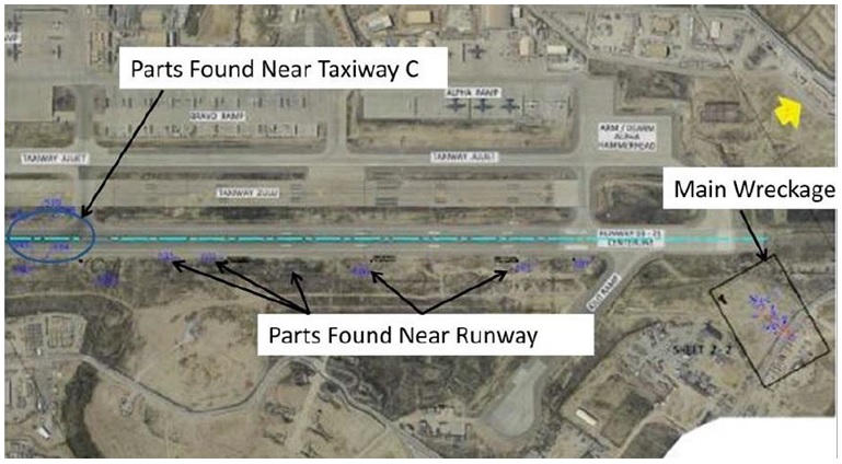 Debris from the aircraft remote from the impact site was found on the runway near to taxiway C, including small pieces of fuselage skin, a section of hydraulic return tubing, a piece of the rack on which the CVR and FDR are mounted and part of an antenna from one of the M-ATVs. Other pieces of debris were found near the runway between this point and the crash site.
