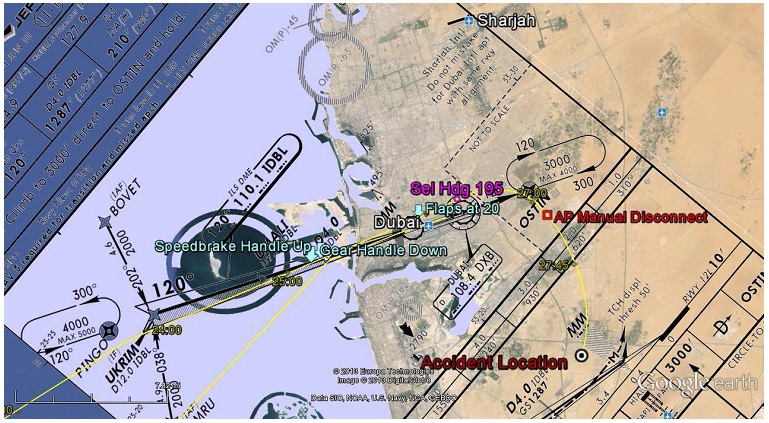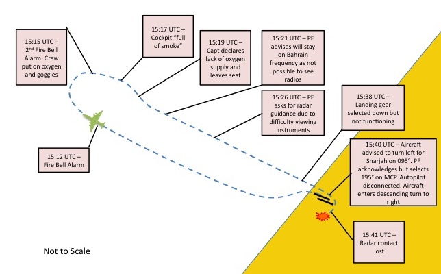 By now it was quite dark. The aircraft reached an intercept heading for the Dubai ILS but at 350 KCAS and 9000 feet altitude was too high and Dubai was over flown north of the runway after the First Officer had replied "negative" when asked if an orbit to reposition on final was possible. The flight was offered runway 30 at Sharjah, which with the aircraft approaching at 4000 feet was 10 nm away to the north east and would require a left turn. The radar heading given - 095º - was acknowledged but instead the aircraft turned right - subsequently this was found to have been because a heading of 195º had been set. Soon afterwards (see the diagram below) the AP was disconnected and as the descent continued, FDR data subsequently showed that pitch control had been lost "due to the de-synchronisation of the control column inputs and the elevators". An uncontrolled descent into terrain followed and, after 59 seconds of EGPWS 'PULL UP' Warnings, impact had occurred 9nm south west of Dubai Airport just under 30 minutes from the time of the fire warning.