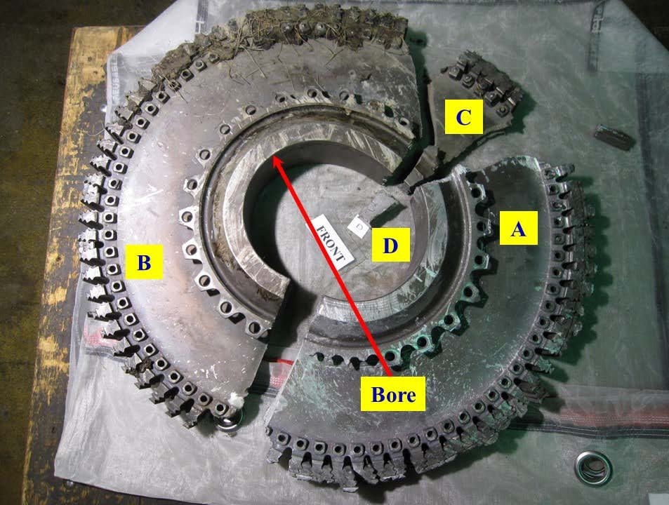 Some debris from the right engine and wing was found on the runway where the engine had failed. Most of the engine’s second stage High Pressure Turbine (HPT) disc, which had disintegrated and had been the source of the failure, was found in four pieces one of which (a 26 kg section labelled ‘A’ in the illustration of the recovered disc fragments below), had passed though the inboard section of the right wing, over the fuselage and into a UPS warehouse facility 895 metres south of the engine failure position. The origin of the initial fatigue fracture was found by visual laboratory examination of the fragments which identified a discoloured (heat-tinted) area on the disc surfaces separating fragment A and fragment B. This disc had failed after 10,984 cycles out of a life limit of 15,000 cycles.