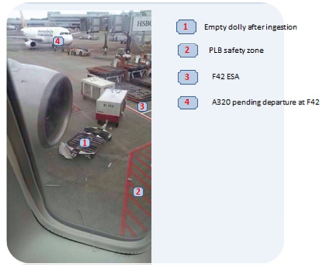 It was established that the ingested container and two attached baggage trailers had been wholly within the designated Equipment Restraint Area (ERA) of the designated arrival gate F37 at the time the gate entry guidance system had been switched on by the ground service provider personnel covering the arrival of the accident aircraft. They were located just clear of the red hatched area marking the extent of the Passenger Loading Bridge (PLB) safety zone.