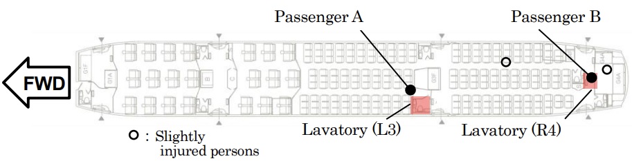 Out of the nine cabin crew, only the SCCM had time to sit down while the others were in any case away from their stations attending to passengers and two of them lost their balance and sustained minor injuries. One of the 214 passengers who was waiting in a queue to use lavatory L3 (see the illustration below) lost their balance and fell to the floor sustaining an avulsion fracture to their right foot. Another was sitting down in lavatory R4 and sustained a lumbar compression injury as a result of their upper body being “strongly squeezed longitudinally”. Both passenger injuries were classified as being “serious”. The remainder of the flight was without further event and aircraft landed at its destination just under half an hour after the sudden and brief turbulence episode.