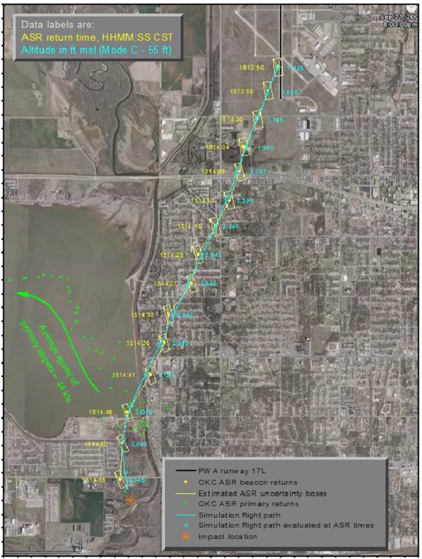 The overlaid aerial picture above shows the aircraft track and altitude based on recordings from the Oklahoma City Airport (OKC) surveillance radar. The green primary returns are from birds - assessed visually as likely to have been Pelicans - which were calculated to have been flying at an average speed of 44 knots over Lake Overholser to the south west of and close to the departure airport.