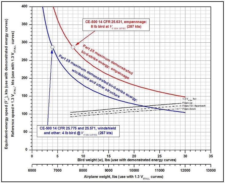 The Investigation noted that pilot awareness of the role of airspeed in reducing the risk of damaging bird impact could be heightened by taking more account of reference charts that show the relationship between aircraft speed and bird weight for equivalent bird-strike energy. To that end, the Investigation included an example of such a chart applicable to a Cessna 500 in its Final Report. This is reproduced below and shows two bird-strike energy speed curves, a blue line corresponding to the 4 lb bird at 287 knots and a red line corresponding to the 8 lb bird at the same speed. It also shows the minimum safe airspeed (1.3 times the stall speed) as a function of weight and in various flap configurations - shown as solid, dashed or dotted black lines.