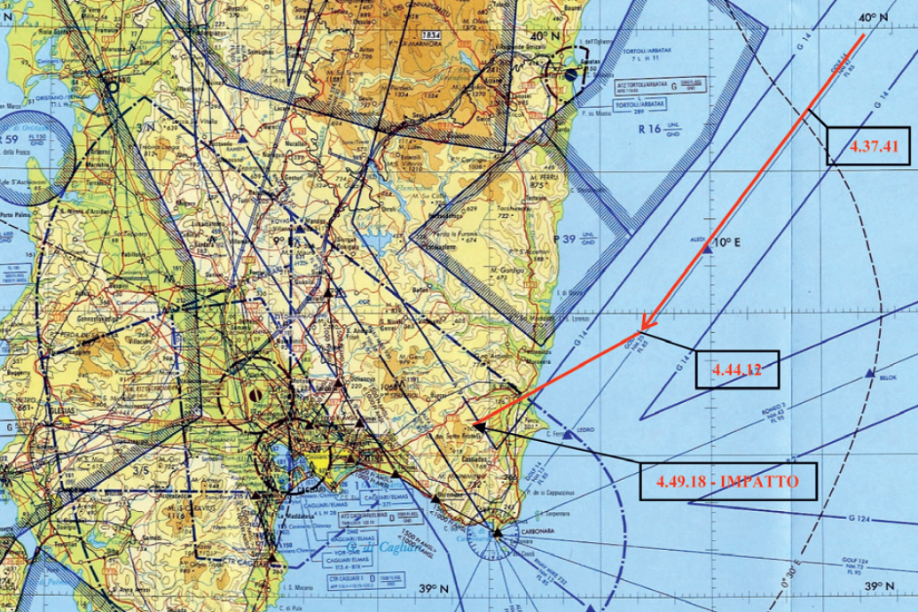 The aircraft checked in with TWR and was instructed to call on short final. In acknowledging this instruction, the aircraft commander reported their position as 23nm from the Cagliari passing an altitude of 4800 feet. Collision with terrain on track in the Sette Fratelli mountains occurred close to the 3333 feet high summit of Mount Bacumalu in “dark night” VMC just over a minute later. The aircraft was destroyed by the impact and a fuel-fed fire which followed and all six occupants were killed.