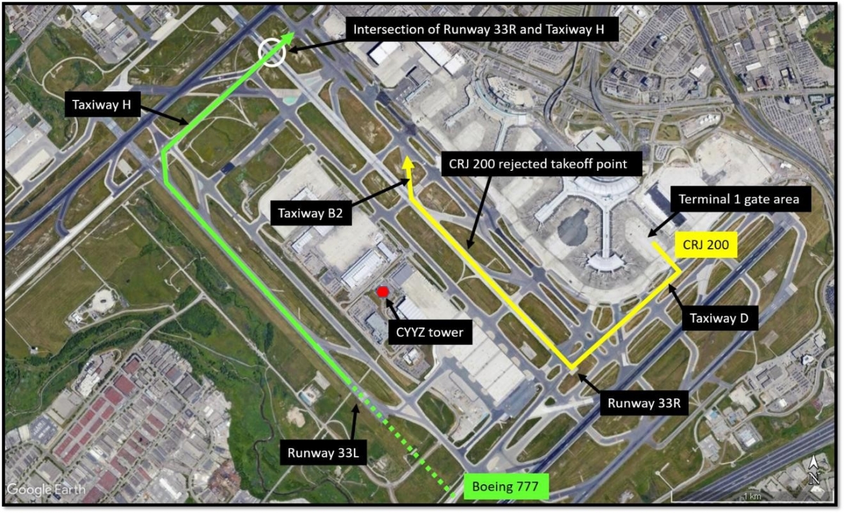 On 9 August 2019, a Bombardier CRJ-200LR, (C-GKEJ) being operated by Air Georgian on a scheduled international passenger flight from Toronto to Ohio as CGN7339 commenced takeoff on runway 33R as a Boeing 777-300 (C-FIUR) being operated by Air Canada on a scheduled international passenger flight from Copenhagen to Toronto as ACA883 was crossing the runway at an intermediate intersection after landing in normal day visibility. On seeing the 777 ahead, the CRJ carried out a high speed rejected takeoff and were able to clear the runway well before reaching the intersection at which the 777 was crossing.