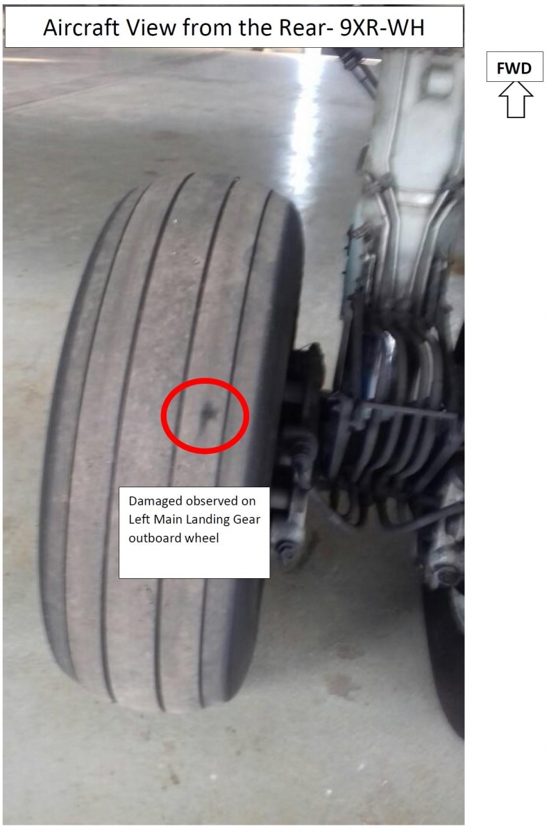 It was noted that the same post flight inspection which had found the fan blade damage also found previously undetected damage to the left main landing gear outboard tyre in the form of a single “punch-type” tread depression (see the illustration below).