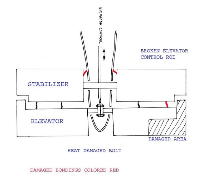 A diagram showing the broken elevator control rod and adjacent damaged bonding wires (reproduced from the Official Report)