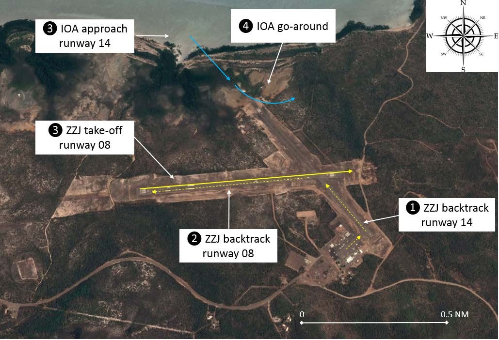 The BN2 pilot planned for a straight approach to runway 14 - a landing-only runway due to adverse terrain beyond the far end - and continued making all the required CTAF arrival radio calls including position calls at 10 nm, 5 nm and 3 nm prior to joining final approach. Meanwhile, the DHC8 First Officer broadcast his aircraft's entry and backtracking of runway 14 and intention to take off from runway 14 and held short of runway 08 to allow the aircraft doing circuits to complete a touch and go. Whilst backtracking, the DHC8 crew heard a CTAF call from the aircraft inbound from Badu Island that it would be joining the runway 08 circuit No 2 to the training aircraft in that pattern. They then noticed another aircraft (the BN2) on their TCAS display and in response to a query to it were told by its Pilot that he was "approaching a 3 nm final for runway 14 and that they would have time to depart from runway 08 if they were quick". At about this time, the DHC8 was reaching the beginning of runway 08 and the aircraft was lined up for departure whilst the short pre take-off checklist was completed. The CTAF frequency was briefly occupied by communication between two distant aircraft and by the time BN2 pilot heard the DHC8 broadcast "rolling for departure from runway 08", he was "at about 400 feet on final approach for runway 14". He subsequently stated that at about 300 feet, he had broadcast "hold short" to the DHC8 but the DHC8 Captain reported he had heard this transmission as "land and hold short of runway 08" and so had continued the take-off’. As the BN2 approached 100-150 feet on final approach, the DHC8 had still not crossed the runway intersection and so its Pilot broke off the approach and commenced a climbing left hand turn away from the runway and keeping clear of runway 08 and its extended centreline so as to join downwind for a landing on runway 08. The Captain of the DHC8 reported looking out of his left window as the aircraft made its initial climb overhead the threshold of runway 26 and seeing the BN2 "turning through east at about the same level". The annotated diagram below shows the relative ground tracks of the two aircraft.