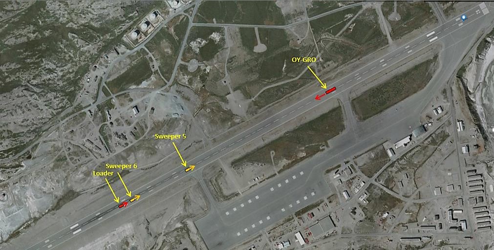 As the aircraft passed taxiway 'C', (see the annotated aerial view above), the first vehicle was about to vacate the runway as cleared at taxiway 'D' but the other two still had around 500 metres to go before reaching that point. The take-off was continued and the aircraft became airborne approximately 35 seconds after starting to roll, subsequently passing approximately 300 feet overhead of the nearest vehicle. It was estimated that the closest the aircraft had come to any of the vehicles before becoming airborne was approximately 900 metres. It was reported that "the student air traffic controller at Sondrestrom TWR observed that the aircraft had started its take-off roll and pointed it out to the instructor air traffic controller" and that "for a short while, the instructor air traffic controller considered an instruction on (instructing a rejected) take-off but had (by then) noticed that the aircraft had started rotating".