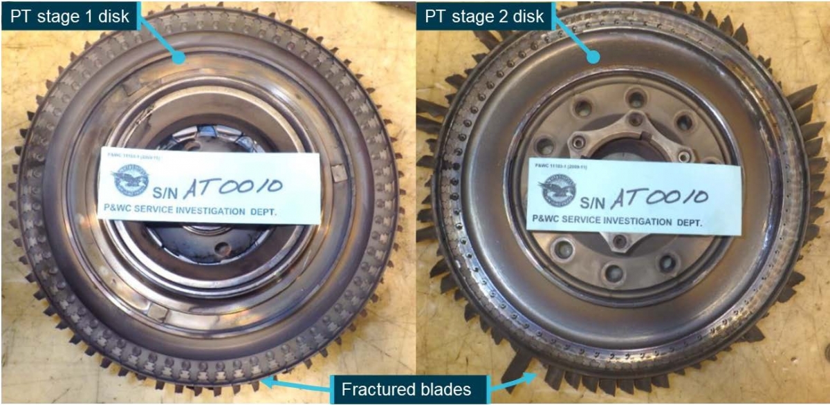 After the right engine had been removed from the aircraft, it was possible to see that all the second-stage Power Turbine (PT) blades had separated from the disk (see the first illustration below) and that although it was not possible to rotate the PT assembly, the propeller shaft could be turned freely.