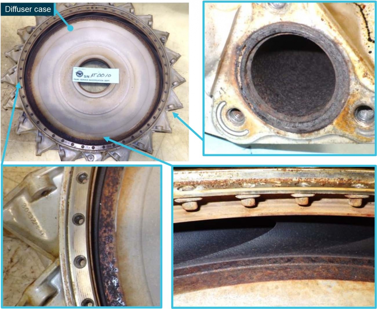 - The diffuser case, which contained the LP centrifugal impeller, showed corrosion at several locations (see the second illustration below) and the LP impeller blades showed leading edge erosion.