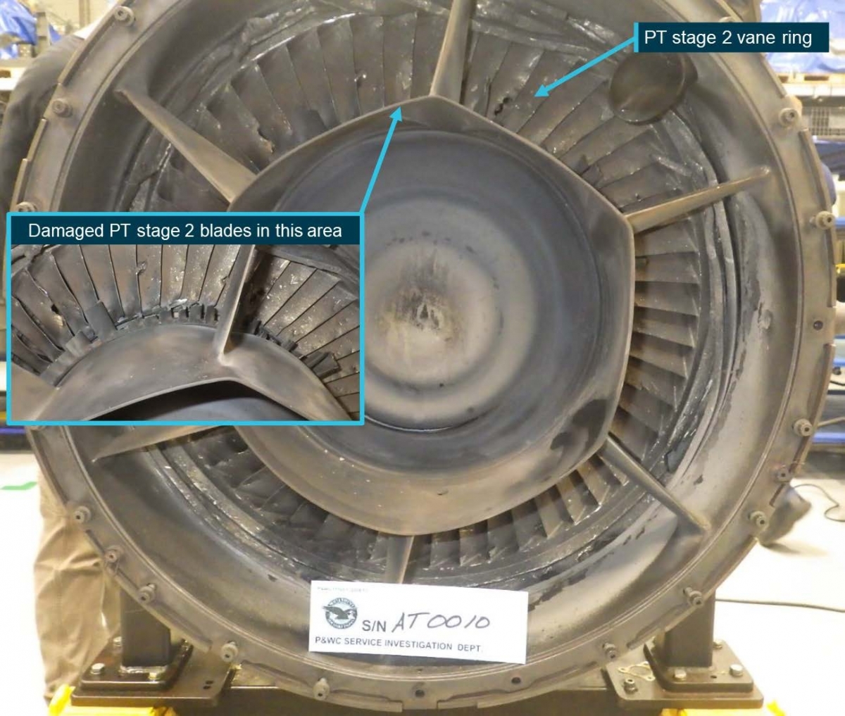A rear view of the removed engine showing the second stage power turbine damage. [Reproduced from the Official Report]