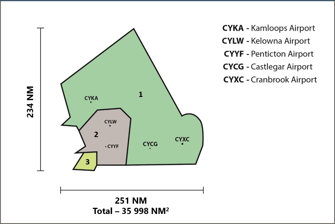 It was noted that the Vancouver ACC Airports section included two sectors identified as Kamloops (KA) which covered all airspace up to FL 250 except airspace up to 13000 feet defined as the smaller Kelowna (LW) (see the illustration below). At the time of the investigated event, only a few aircraft were scheduled to Kelowna and so the two sectors were combined. The only controller involved in this event had been working in the Airports section of the Vancouver ACC for almost 15 years. It was noted that with the KA sector lateral extent all on the controller’s traffic display screen (an area which was not increased when the KA and LW sectors were combined), an inch (2.54cm) on the screen represented a distance of 14.3 nm.