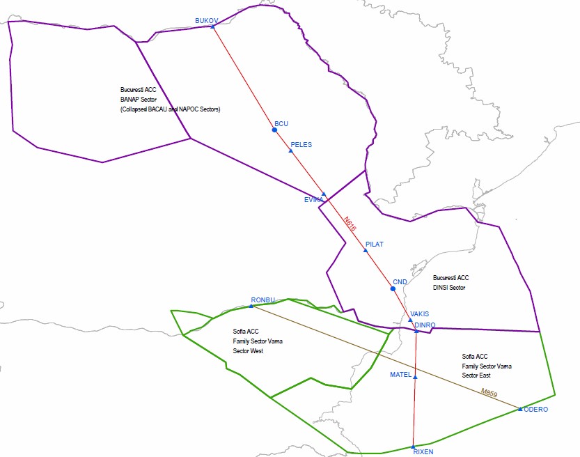 It was established that the E170 was tracking south eastwards after entering Romanian airspace at FL370 and had been identified on radar when, after 12 minutes, its squawk disappeared from all controller work stations at Bucharest ACC. No attempt was made to query this with the aircraft but during discussion between controllers in the BANAP sector where the aircraft had been when its squawk disappeared and the next ACC sector (DINSI) along its flight planned route, the BANAP sector executive controller "stated that LOT 7293 overflew the sector an hour before". One minute later, in the DINSI sector from which the aircraft would be expected to enter Sofia ACC airspace (see the illustration below), an automatic message was generated with the E170 at FL350 and sent to Sofia ACC. There was still no attempt made to communicate with the E170 or any transmission received from it and it was not transferred to the next sector.