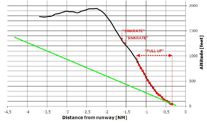 by which time the aircraft was (see the illustration) well above anything that might be regarded as a normal descent profile. The aircraft was descended at a rate that led to activation of the Terrain Avoidance and Warning System (TAWS), first with the annunciation of two ‘sink rate’ warnings and then by a prolonged series of ‘Pull Up’ warnings, all of which were ignored. By 800 feet aal, the sink rate had reached 4000fpm and pitch angle during the final approach was found to have varied between -2° and -20°. The runway threshold was crossed at a height of 300 feet agl at a speed of 150 KIAS and with a pitch of -12° and the eventual touchdown was nosewheel first at 118 KIAS in a position 910 metres along the 1800 metre-long runway. With the main landing gear still in the air, the aircraft continued along the runway on its nose wheel until, with 320 metres remaining, the left main gear, quickly followed by the right main gear, touched down. Directional control was lost during deceleration and there was a partial excursion off the left hand side of the runway and re-entry before the aircraft overran the end of the runway on the left hand edge and came to a stop 60 metres further on.