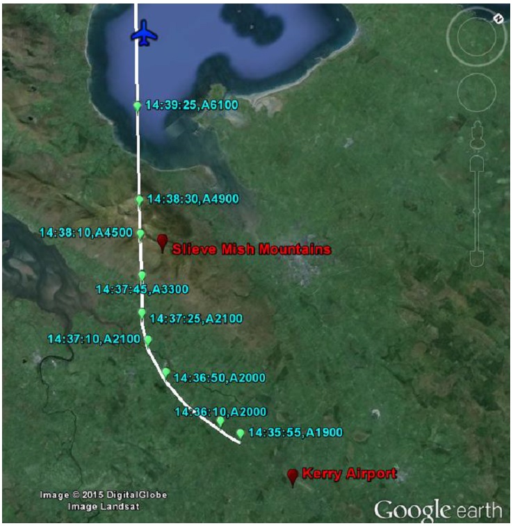 The diagram above shows the aircraft level at 2000 feet heading towards the Slieve Mish Mountains which rise to 2800 feet and then the climb in response to the instruction from Shannon to expedite though 4000 feet. The aircraft commanders written report included "our altitude climb instruction was 'climb level Two Hundred' […] as we began to climb we had some confusion as to what the altitude clearance limit was as we were unsure what level Two Hundred meant (so) we levelled at Two Thousand feet to ensure we didn't exceed any altitude limits".