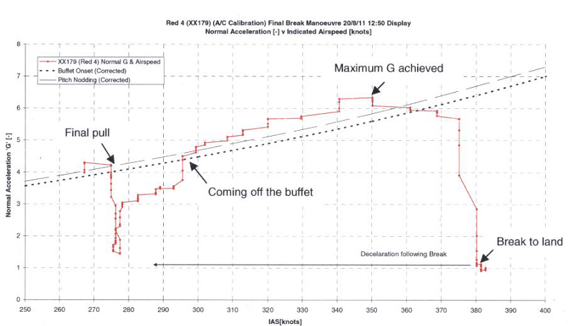 The exposure of the pilot to G during the whole accident sortie was determined and it was established that there had been 8 excursions above 4 G of which only one had exceeded 3 G for longer than the one which had peaked at 6.327 G as the break to land had been initiated. This was for 11.625 seconds (compared to the elapsed time of 8.75 seconds in excess of 3 G in the break to land excursion) but had involved a maximum of only 4.468 G. However, during the break at the end of the display which preceded the break to land, it was found that a maximum of 6.248 G had been reached with 7.25 seconds over 3 G - not far in both respects from the exposure in the subsequent break to land.