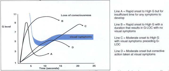 Most of the rest of the Investigation focused on the subject of G-induced impairment in general and its potential relevance to the observed cessation of normal control. The generally accepted relationship between the rate of onset of high G and the time immediately after the maximum level is reached in respect of the risk of experiencing G-LOC or A-LOC with no prior visual warning signs was noted as being generically in the form of the illustrative diagram below reproduced from the Investigation report.