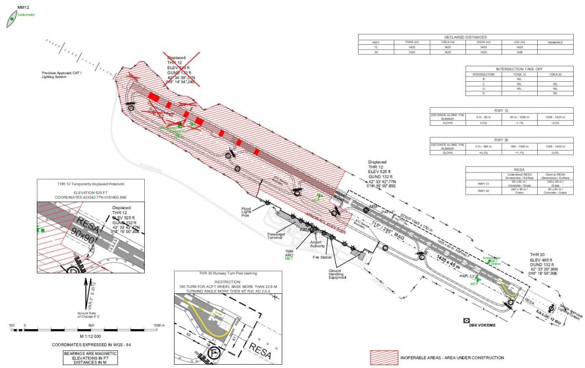 It was found that at the time of the event a major runway reconstruction project was under way at Dubrovnik where, when fully operational, the single runway would have been 3,300 metres long and 45 metres wide. At the time of the event the longitudinal profile of the runway in its 12 direction was characterised by a brief and minor upslope until the TDZ followed by a minor negative slope thereafter. The reconstruction project had commenced at the beginning of November 2018 and was due to be completed in mid March 2019. At the time of the investigated event, Phase 2 of the project was under way and involved the work over the full width of 1732 metres of the northwest and central parts of the runway. This resulted in the length of runway remaining available for operational use being reduced to 1425 metres at the southeast end - see the illustration below. A NOTAM in respect of Phase 2 of the project had been issued with a commencement date of 25 November 2018 and whilst it referred to the Runway 12 and its IAPs, it gave no other detail and merely referred to AIP SUP 013/2018 being in force from the same date and it was this document which contained the detail on runway closure.