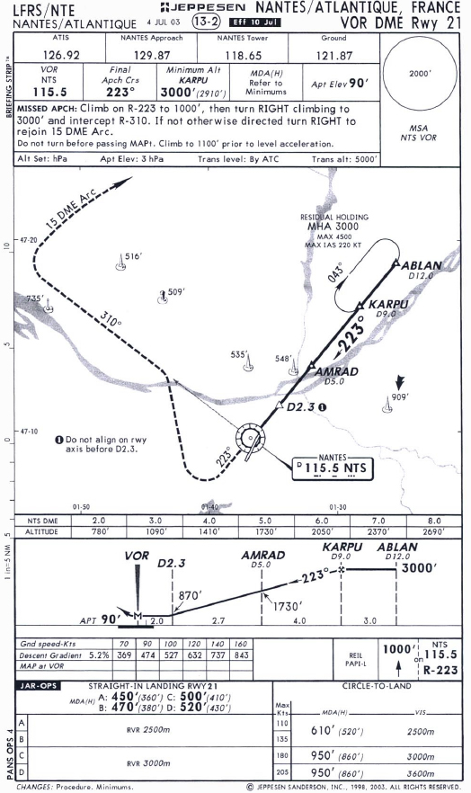 On 21 March 2004, an MD-83 operated by Luxor Air, performed an unstabilised non-precision approach (NPA) to runway 21 at Nantes Atlantique airport, at night and under IMC conditions, which resulted in near-CFIT and a go around contrary to the standard missed approach procedure.