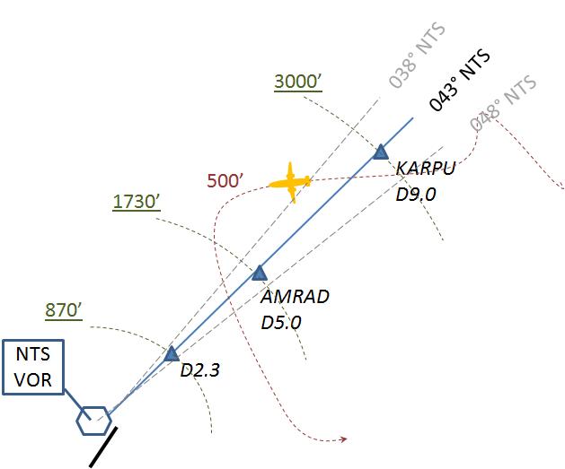 “…the crew was cleared to descend towards 3,000 ft, and was then cleared for approach…The airplane was then on a 330° heading on autopilot in NAV mode (GPS navigation). The co-pilot selected VOR/LOC mode to intercept the 043° radial inbound on the NTS VOR. The airplane was configured for landing and the Captain told ATC…that he planned to descend from three thousand feet to five hundred feet then..[1 minute later]that the airplane was established on the approach radial.