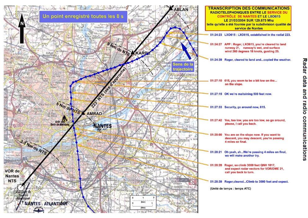 On 21 March 2004, an MD-83 operated by Luxor Air, performed an unstabilised non-precision approach (NPA) to runway 21 at Nantes Atlantique airport, at night and under Instrument Meteorological Conditions (IMC) conditions, which resulted in near-Controlled Flight Into Terrain (CFIT) and a go around contrary to the standard missed approach procedure.