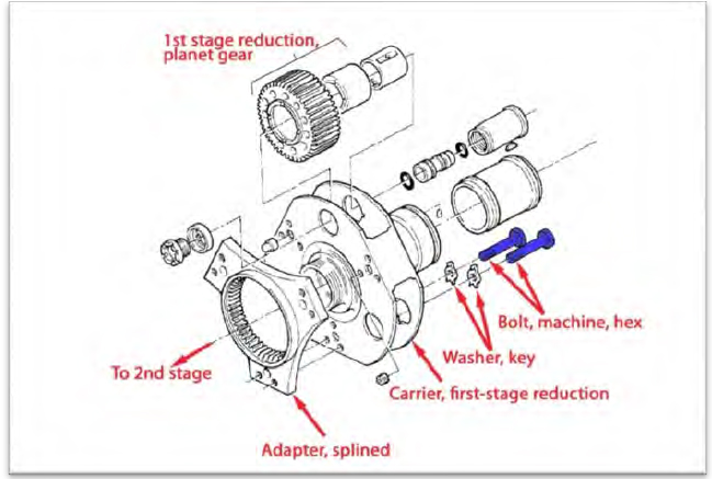 Figure reproduced from the Official Report showing the first stage reduction assembly and the location of the failed bolts
