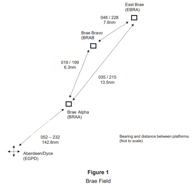 An Investigation was carried out by the Aircraft Accident Investigation Branch (UK) (AAIB). It was established that the flight involved had been the third sector of a four sector sequence flown by the same crew beginning and ending at Aberdeen and involving successive stops at the three platforms of the Brae field in the northern North Sea, approximately 150nm northeast of Aberdeen in the sequence Brae Bravo, East Brae and Brae Alpha. The illustration below is annotated with the distances and bearings between the three platforms.