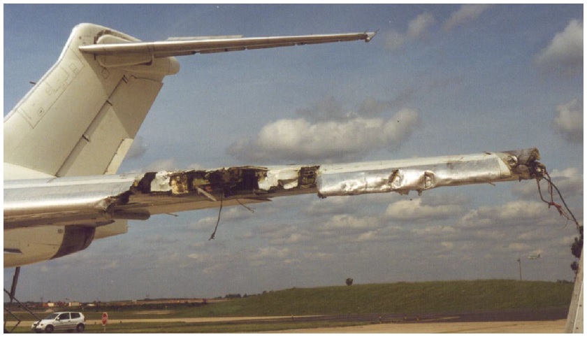 The MD83 showing impact damage to the outer leading edge of the left wing [Reproduced from the Official Report]