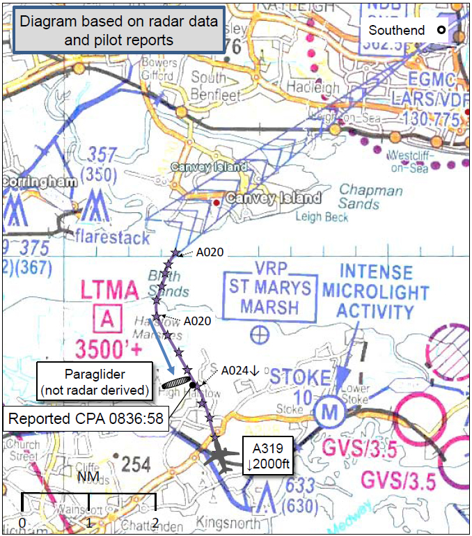 On 18 July 2013, an Airbus A319 inbound to Southend and being radar vectored in uncontrolled airspace was involved in an AIRPROX in day VMC with a Paramotor which was unknown to ATC and subsequently could not be traced. The sighting occurred too late to allow avoiding action to be taken and the A319 pilot reported that the risk of collision had been "very high".