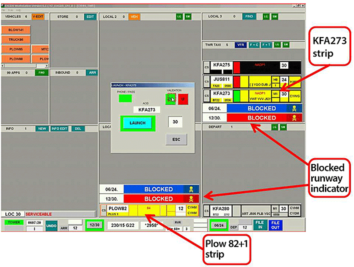 The TWR controllers display showing the overlooked blocked runway indication (reproduced from the Official Report)