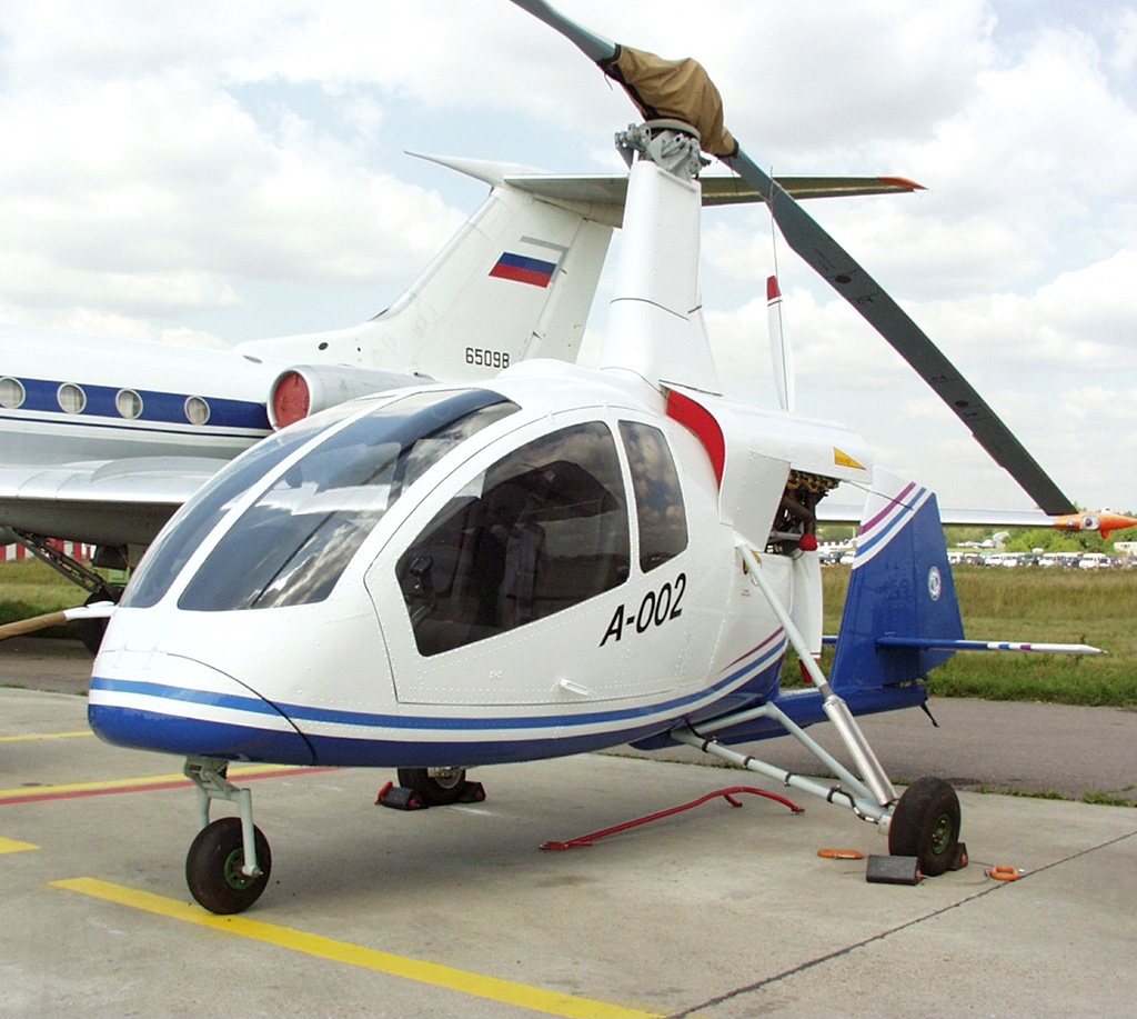 The Irkut A-002 is a three seat, pusher configuration autogyro developed in Russia through the 2000s by the United Constructor Bureau for Light Aircraft team of the Irkutsk Aircraft Production Association (IAPO) Irkut as the first independent product. The take-off from a place is possible when speed of a wind exceeds 8 m/s, otherwise running start up to 15 m is necessary.