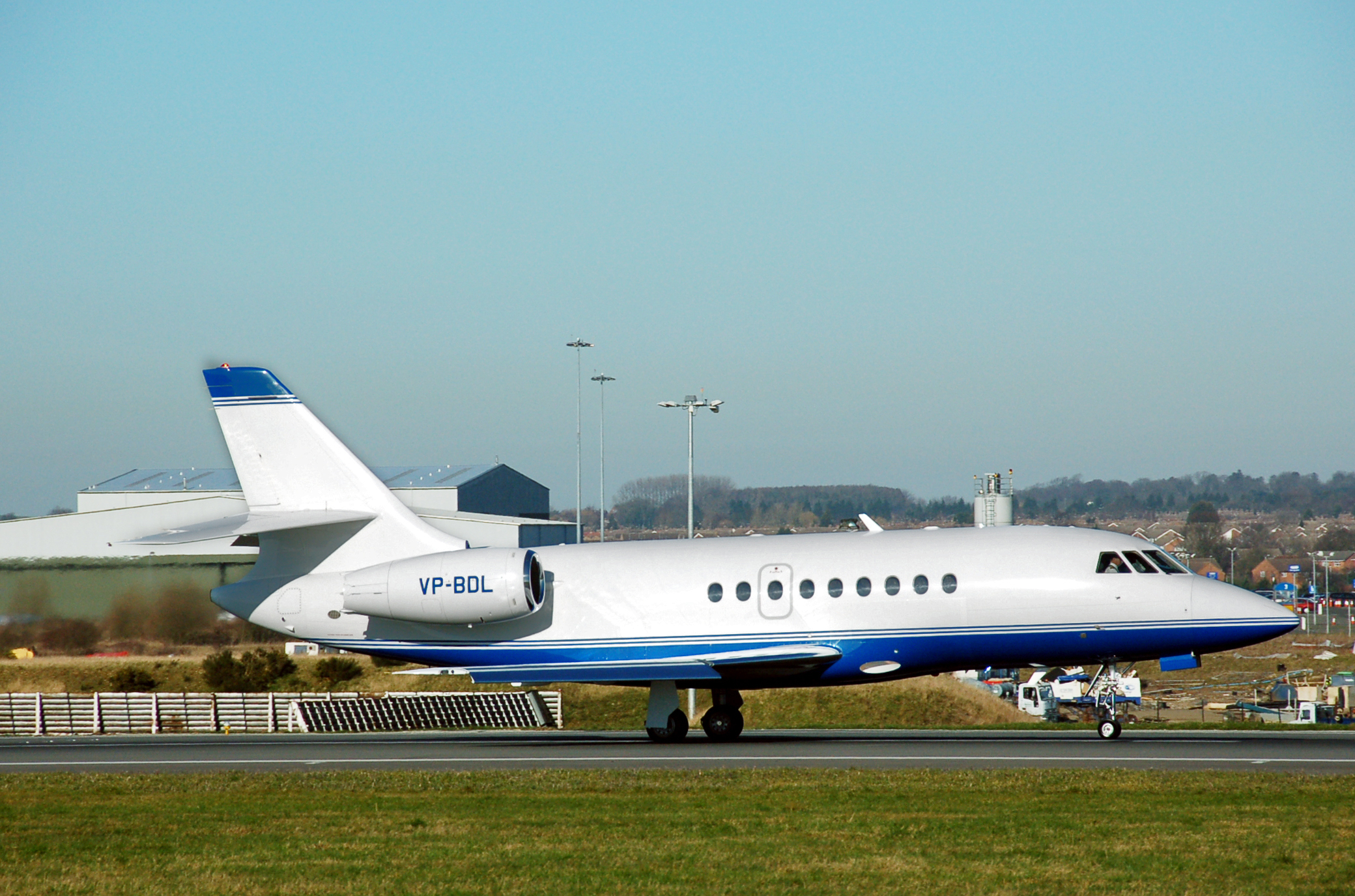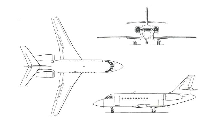 Long range, large size corporate jet. In service since 1995. Twin engine development of long range Falcon 900. Shares the 900s wings and fuselage with modern twin jet design.