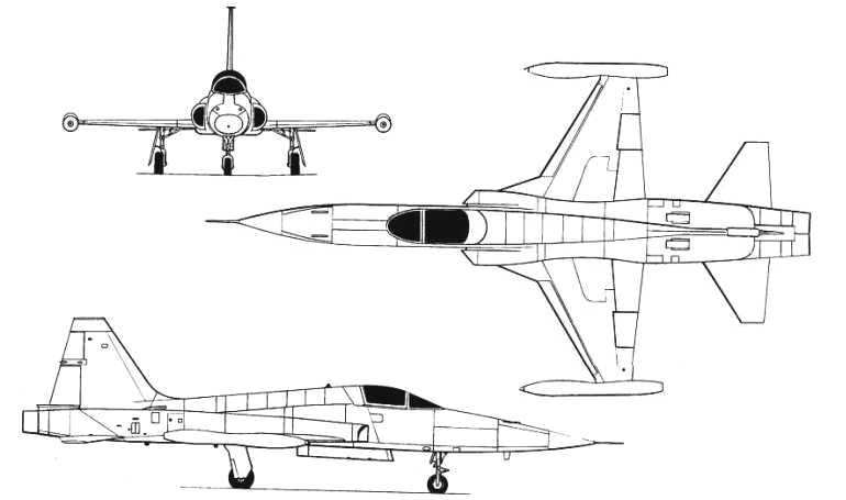 Improved development F-5E/F and RF-5E Tiger 2 with more powerful engines, wing tips and modern avionics. In service with Norwegian, Spanish, Greek and Turkish Air Forces as well as Middle East, Far East, African and South American Air Forces. Still serves as aggressor aircraft with US Navy and Marines. Max Speed: 917kts (Mach 1.6)